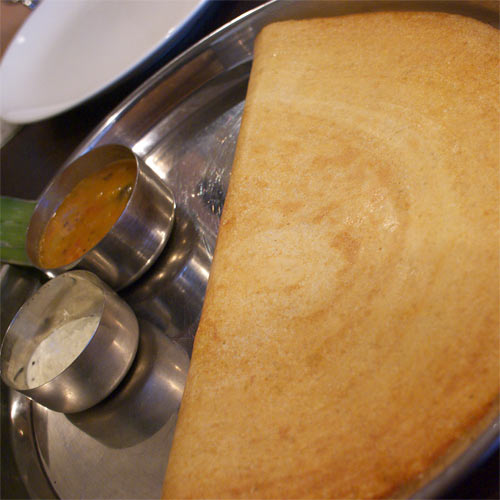 サンバルとチャトニ(ココナッツソース)をつけて。