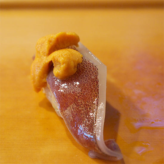 うにもシーズン外だと思いますが、うにの食感と下にある烏賊の食感の対比と味にも奥行きを与えてくれます。