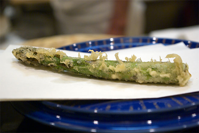 塩で、穂先からどうぞ、とのこと。 穂先の甘さを楽しみつつ、徐々に苦味がひろがっていきます。
