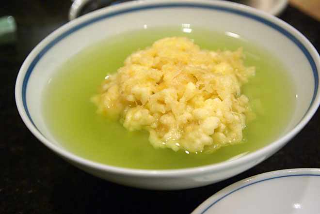 しかし、この天茶。 なぜ、こんなにうまいのでしょう? 抹茶の風味とかき揚げの風味とがよくあって。