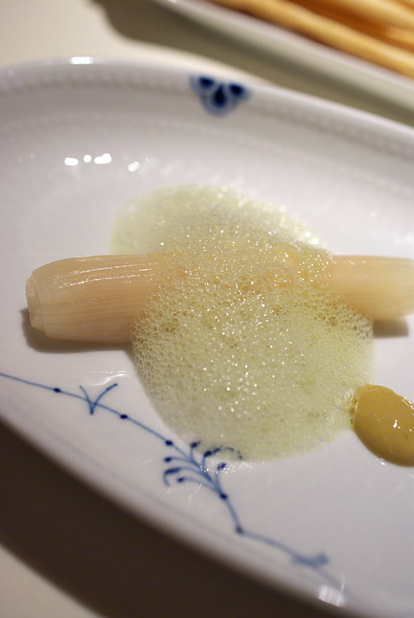 群馬の下仁田ねぎをカネロニ仕立てにしあげ、中には毛蟹のほぐし身をいれて。