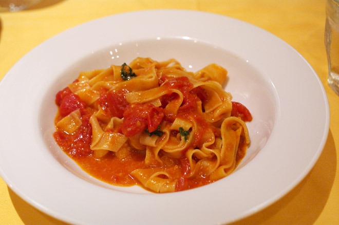 手うちパスタのタリアッテレのトマトとバジルのソース