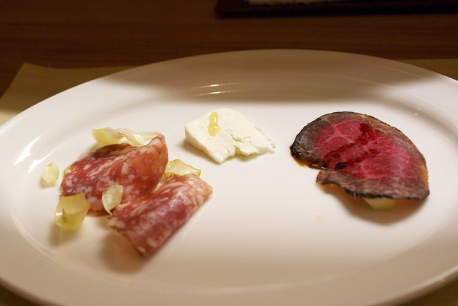 中央には生乳チーズ(ロビオラ産はちみつをかけたもの)。 サラミには栃木産のゆり根を。