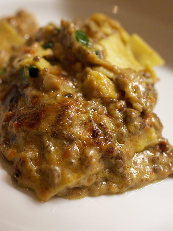 チーズが濃厚な香り。 ミンチ肉やほうれん草(?)、人参、青菜など。