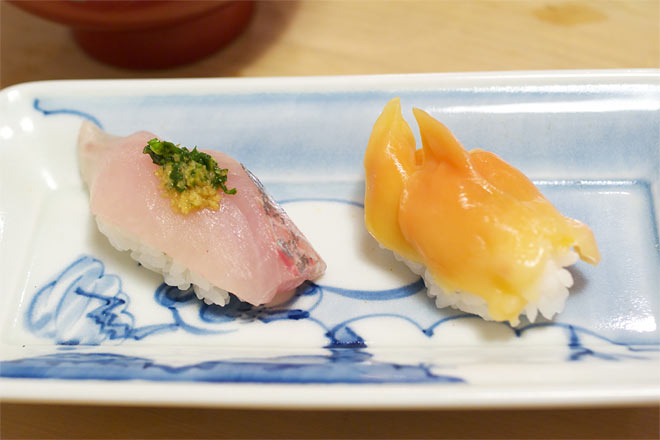 アジ(地もの)と青柳。 前回、青魚の好印象はがっかりな感じに。 季節もあるのかな、、