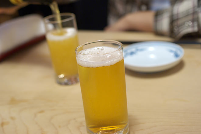 最初はビールで、小さく乾杯。