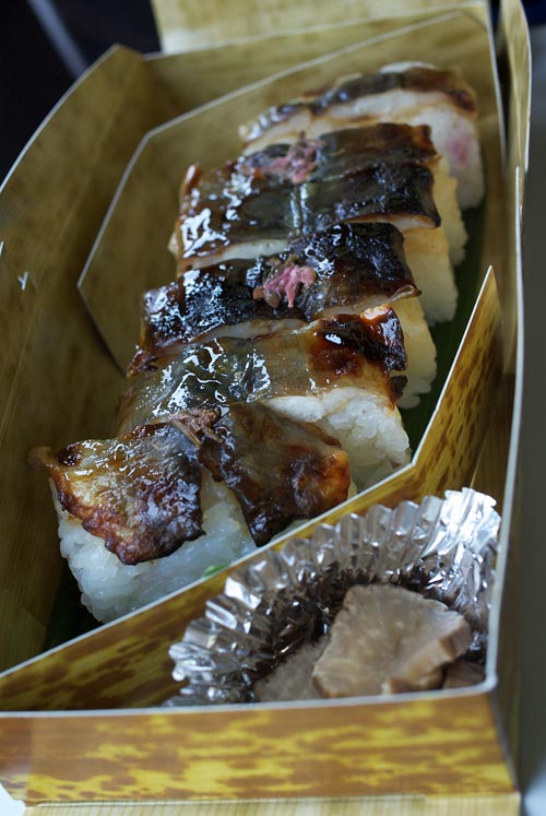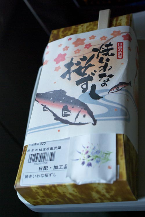 宣伝文句によれば、新鮮な岩魚を秘伝のタレに漬け込んで焼き、桜の香りをつけた押し寿司ということですが、 確かにほんのりと桜の香りがしますが、それよりもちょっと甘さ強めの味わいはお弁当にはいいかもしれません。