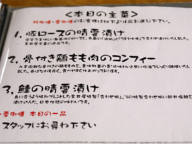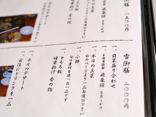 料理はこんな感じですが、やっぱりここはお酒をちびりちびりと行きたいので、メニューを豊富な雪御膳に。