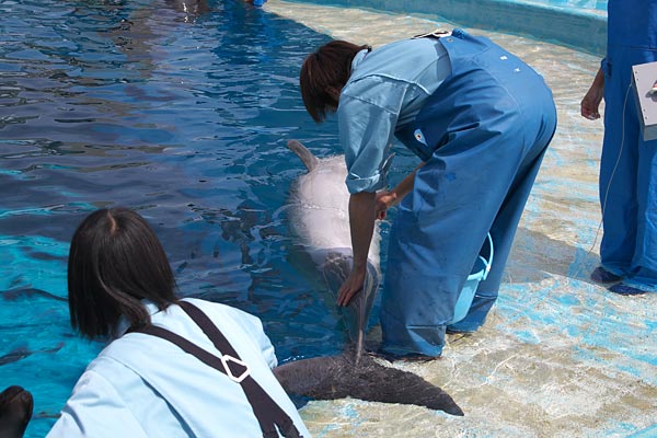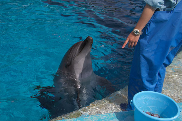 開園直後はいるかプールでは、イルカの朝の軽い体調管理をやっておりました。