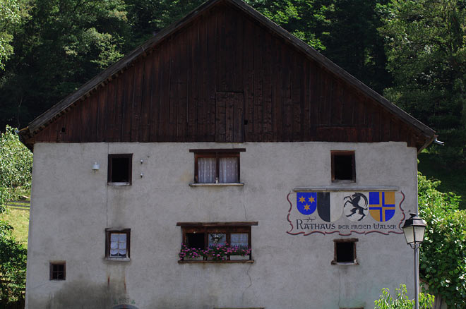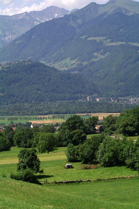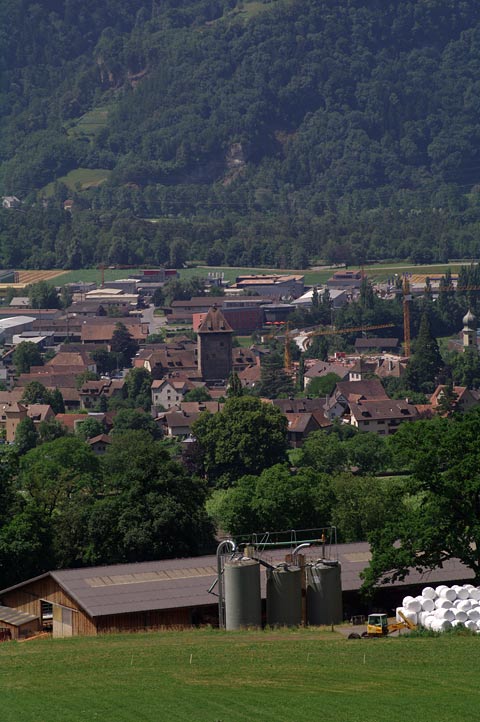 マイエンフェルトを眼下に。 白いのは牧草を貯蔵しておくためのもののようです。