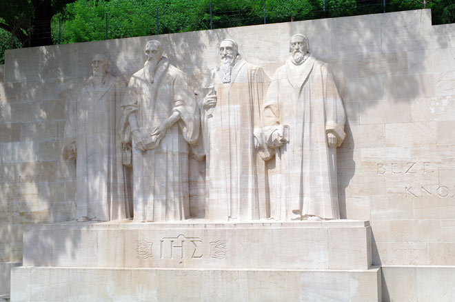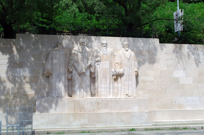 ジュネーヴを本拠地として活動したカルヴァンの生誕400年を記念して1917年に完成した記念碑。カルヴァンをはじめとする4人の宗教改革家の像が刻まれている。