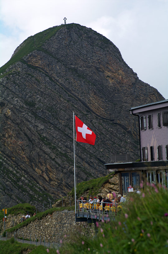 必ず高いところには十字架が。 レストランと国旗ととに、、