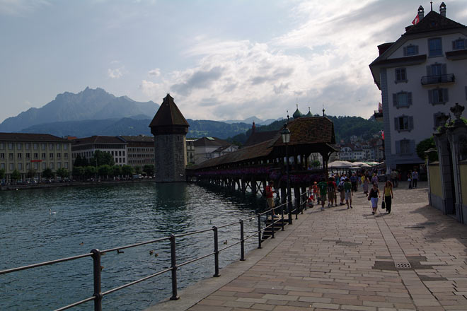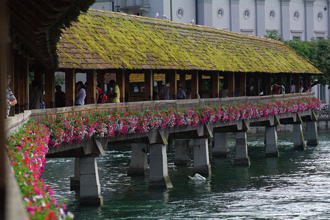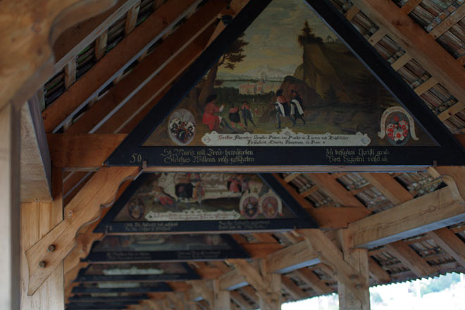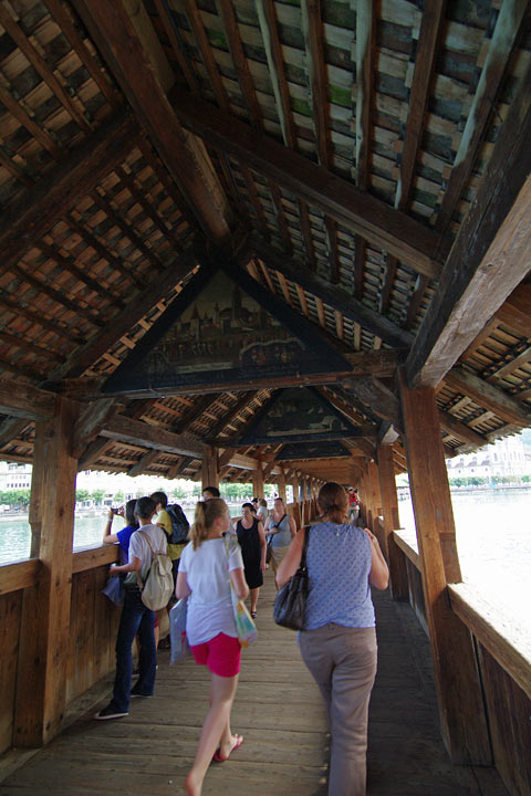 町の要塞のために1333年に作られた屋根付き橋で、内部には17世紀にはルツェルンの歴史が書かれた絵が並んでおります。